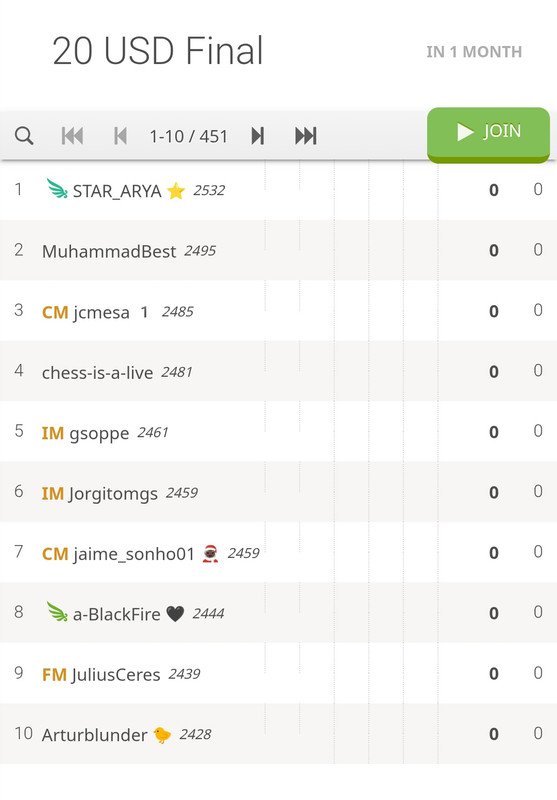 | ChessMood 20-20 Grand Prix3+0 • Blitz • Rated • 2h | Battle of 11 teams | 290 | |